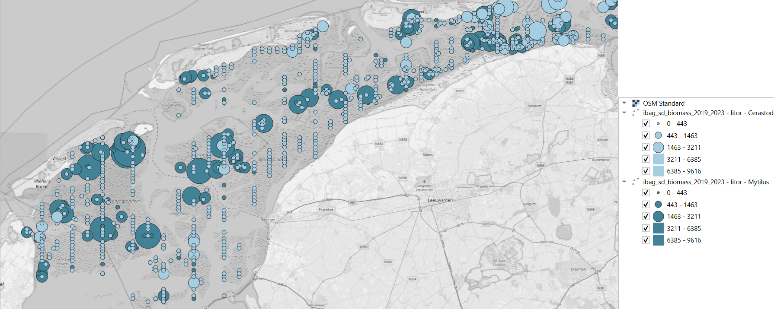 Op deze illustratie is de 5 jaar gemiddelde biomassa (g/m2) van mossel (donkerblauw) en kokkel (lichtblauw) te zien in het litorale (droogvallende) deel van de Waddenzee. Deze dataset is gemaakt op basis van AQUO-conforme OpenData die door WMR is ingewonnen en is online beschikbaar.