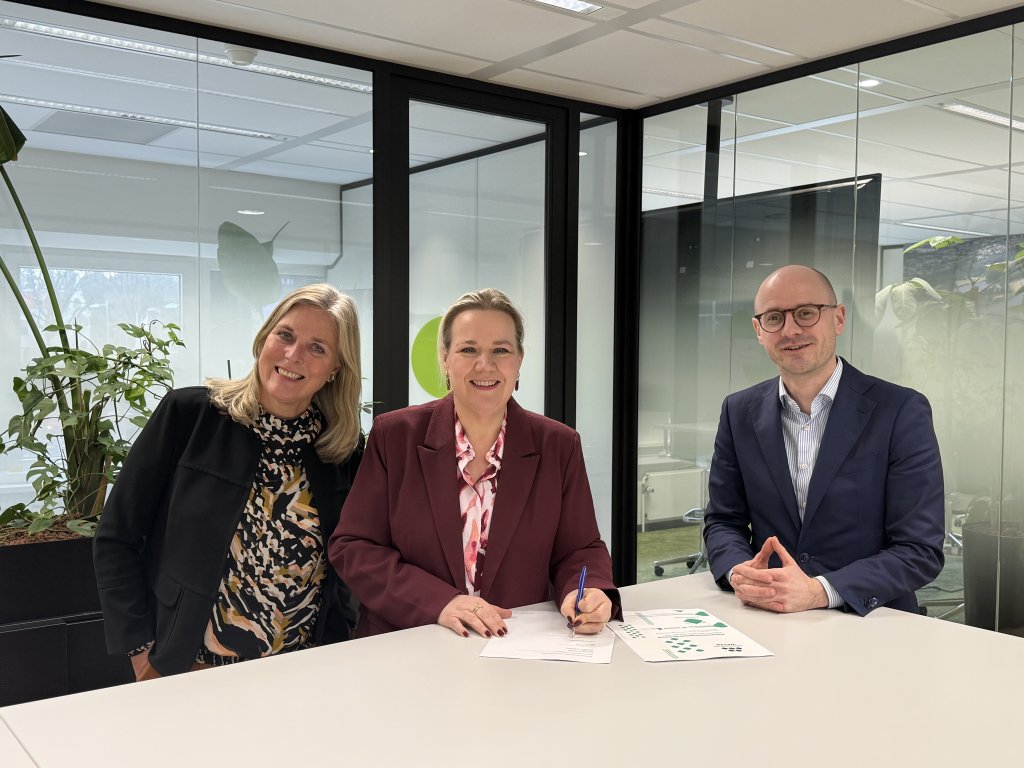 De Samenwerkingsovereenkomst Programma Informatiehuis Water 2029 – 2034 werd op 2 februari in het Bestuurlijk Overleg IHW ondertekend door (van links naar rechts) Katja Portegies (namens Rijkswaterstaat), Floor Wissing - Kunst (namens de waterschappen) en Has Bakker (namens de provincies).